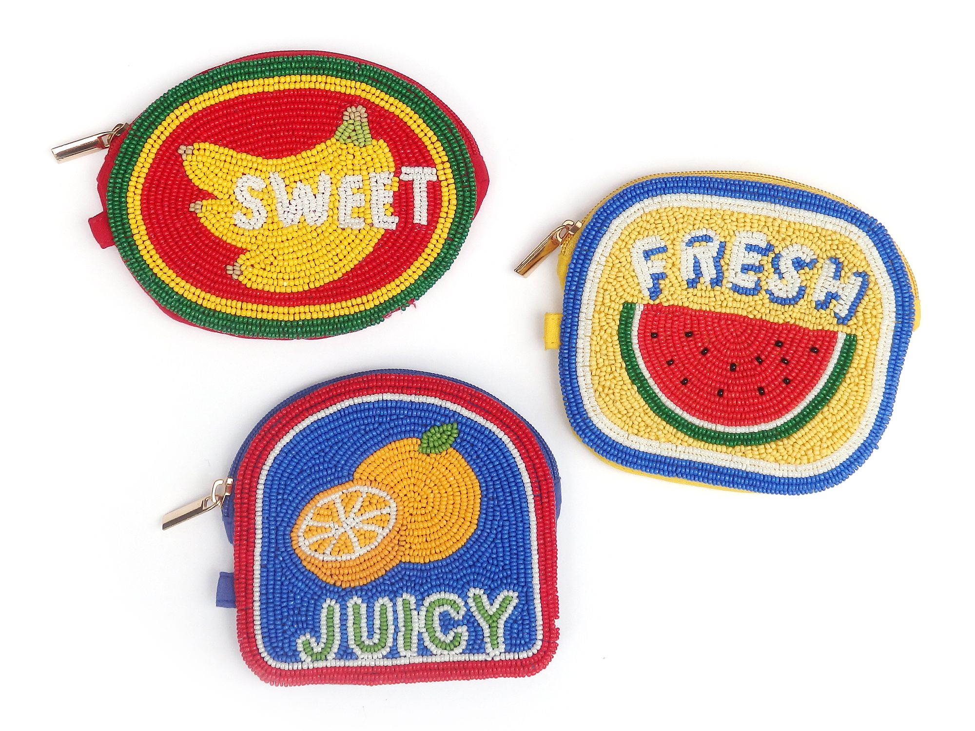 PRICE: 3,200DEL: 4SIZE: Banana: 115*90mm, SUIKA: 110*95mm, ORANGE: 100*95mmMATERIAL: Glass beads, Cotton, MetalMADE IN INDIA