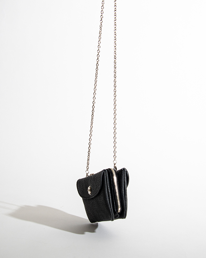 両サイドのポケットに小物を収納、内側のジッパーポケットにコインやお札を収納可能です。