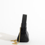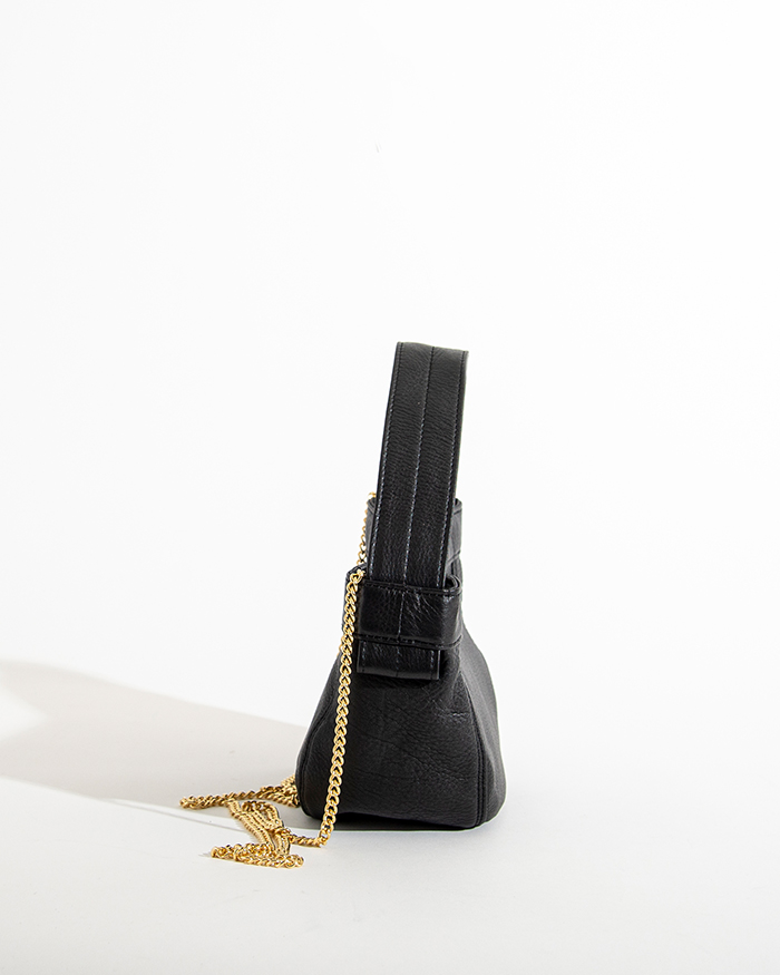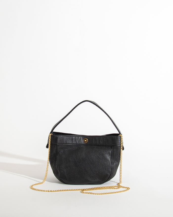 特徴的なホックを口元に使用しています。MINIサイズはストラップを付けて斜め掛け可能です。