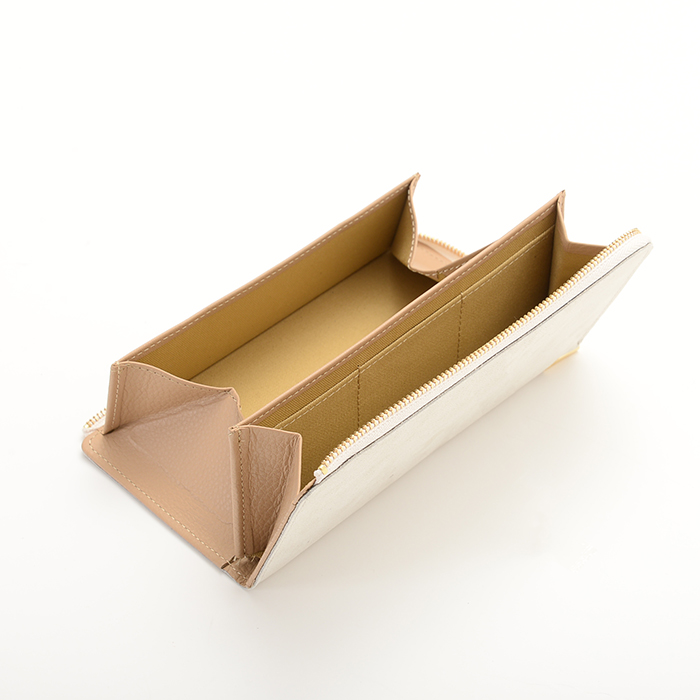 PRICE: 18,000DEL: 2月SIZE: W19 * H9.5 * D1.8MATERIAL: 本体:牛革(箔加工) 内装:牛革 コットン ※グレーのみ本体は山羊革MADE IN JAPAN