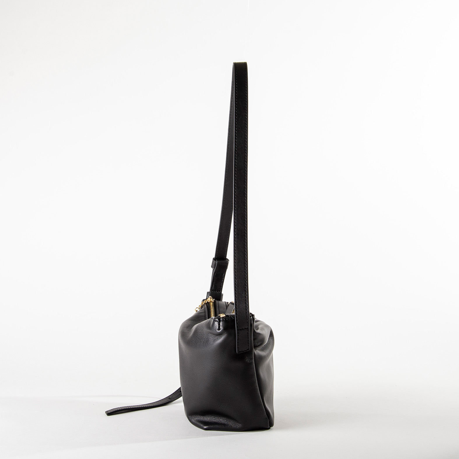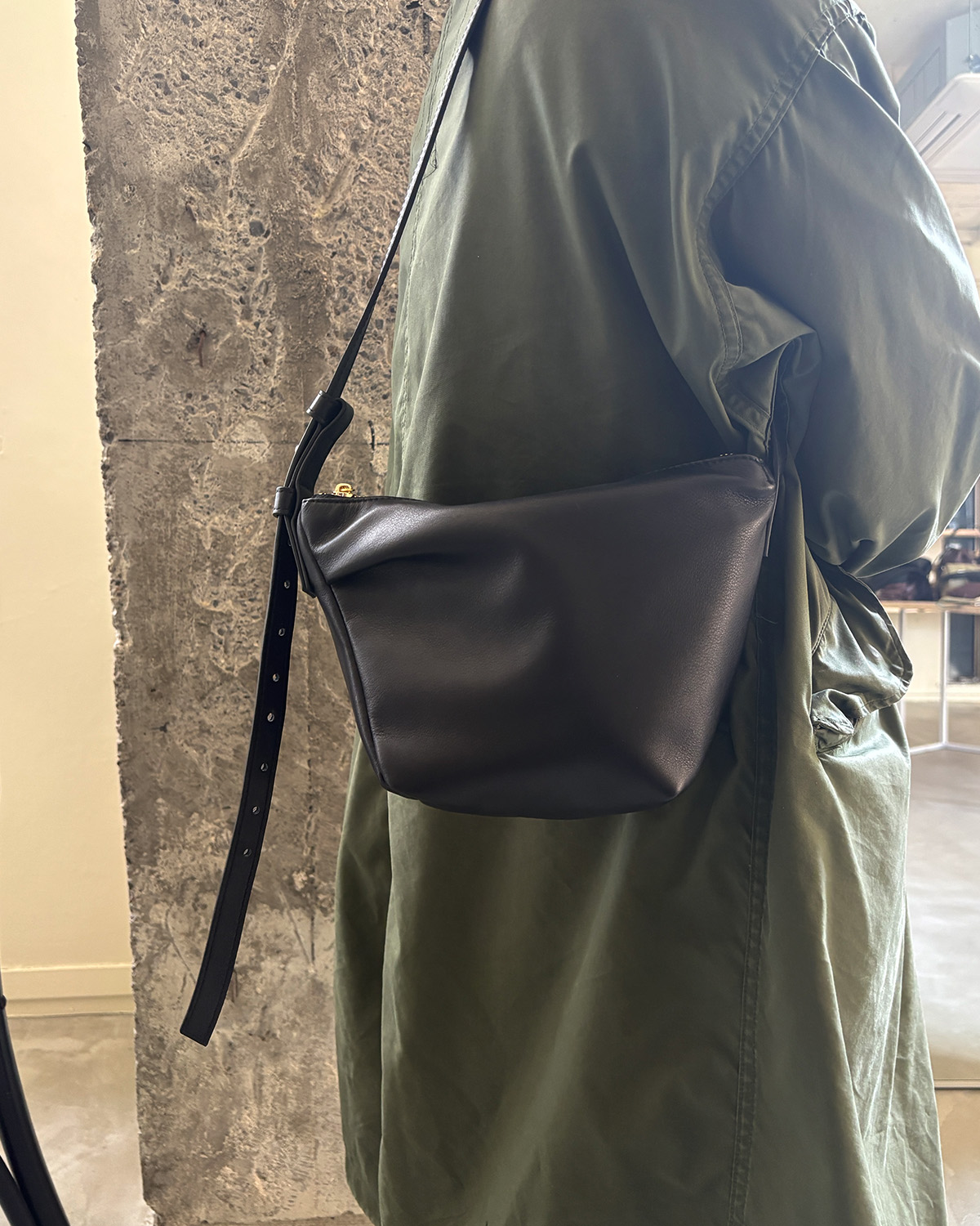 素材には、しっとりと柔らかく、クリーンな印象を与えるカウレザーを使用。モードな佇まいにやわらかさを添えます。