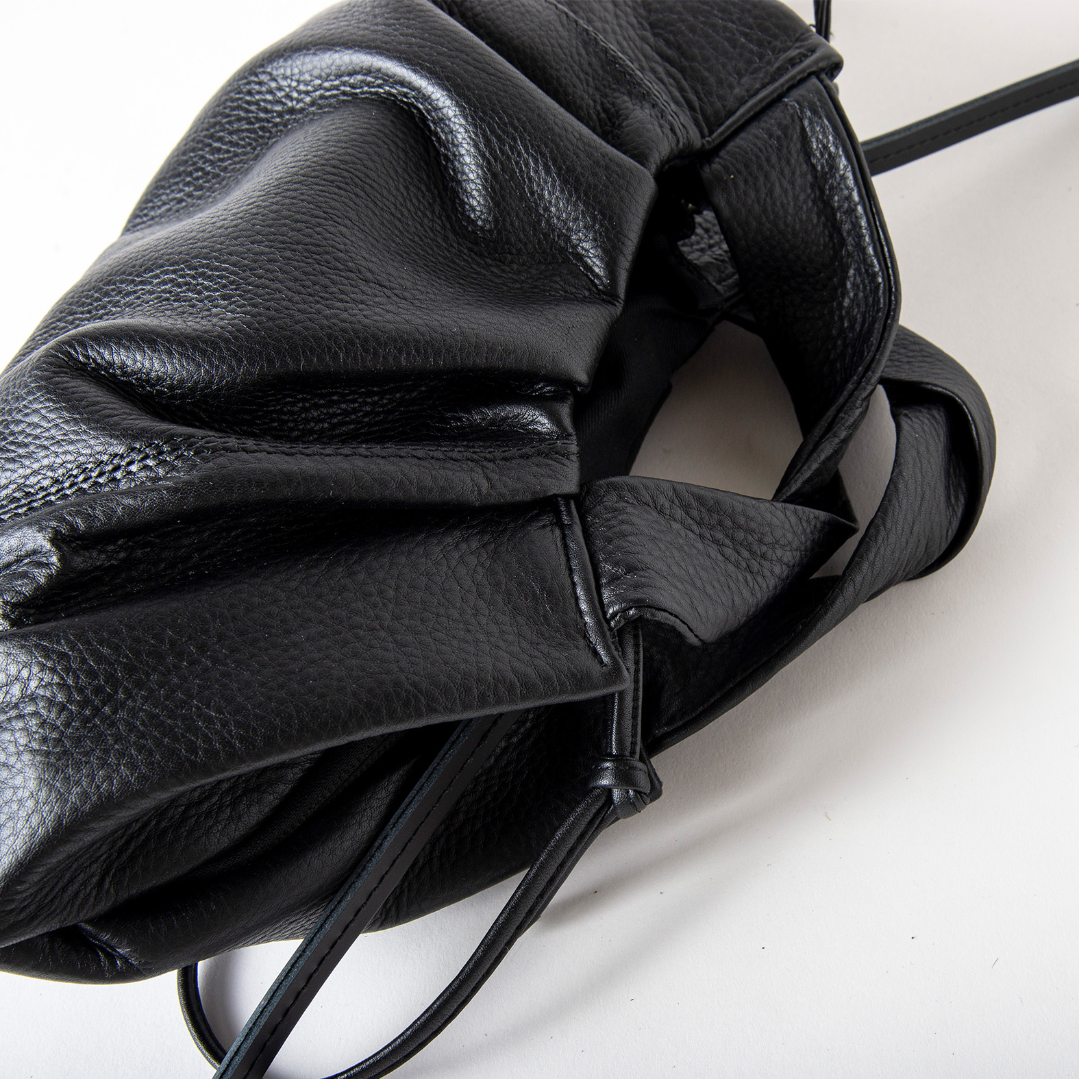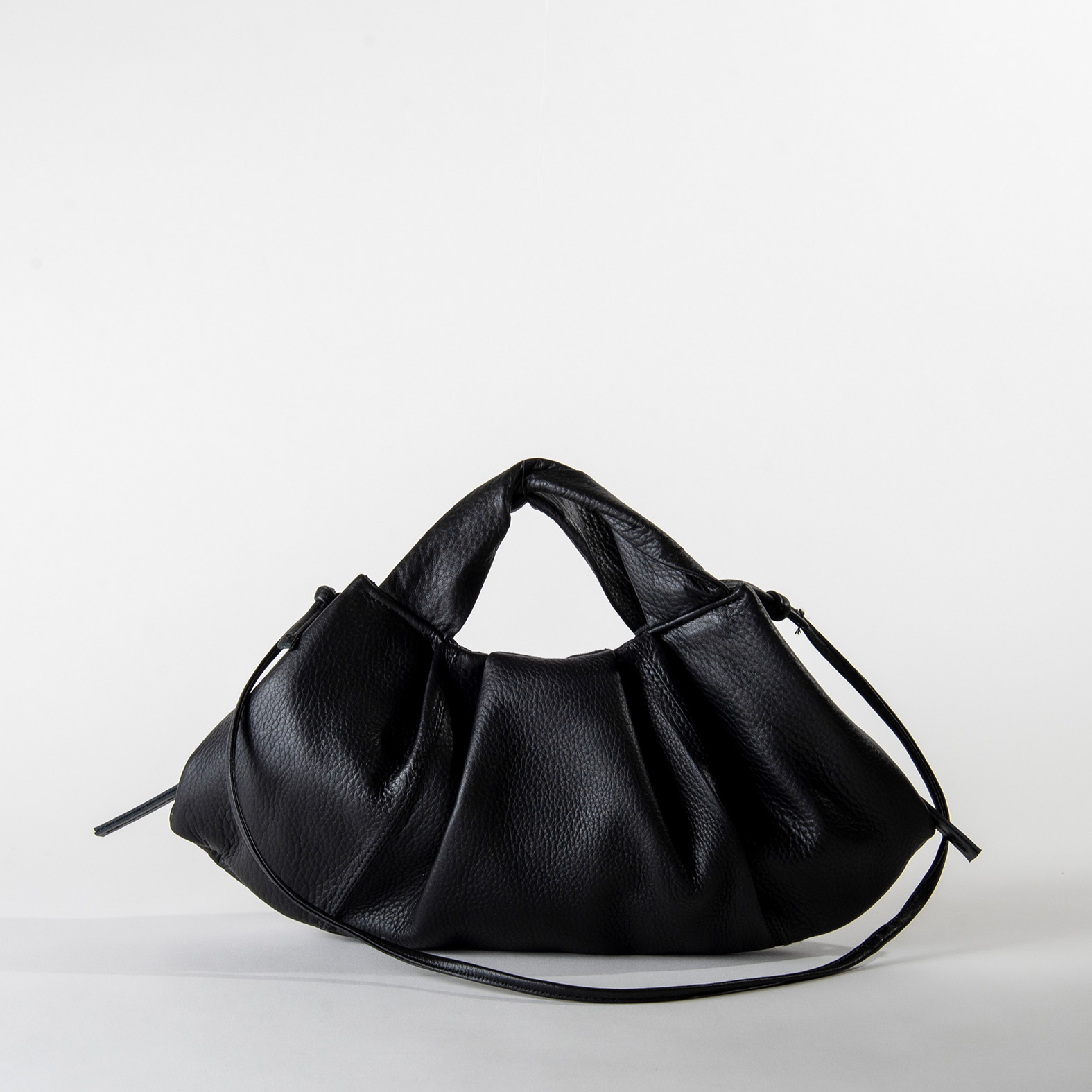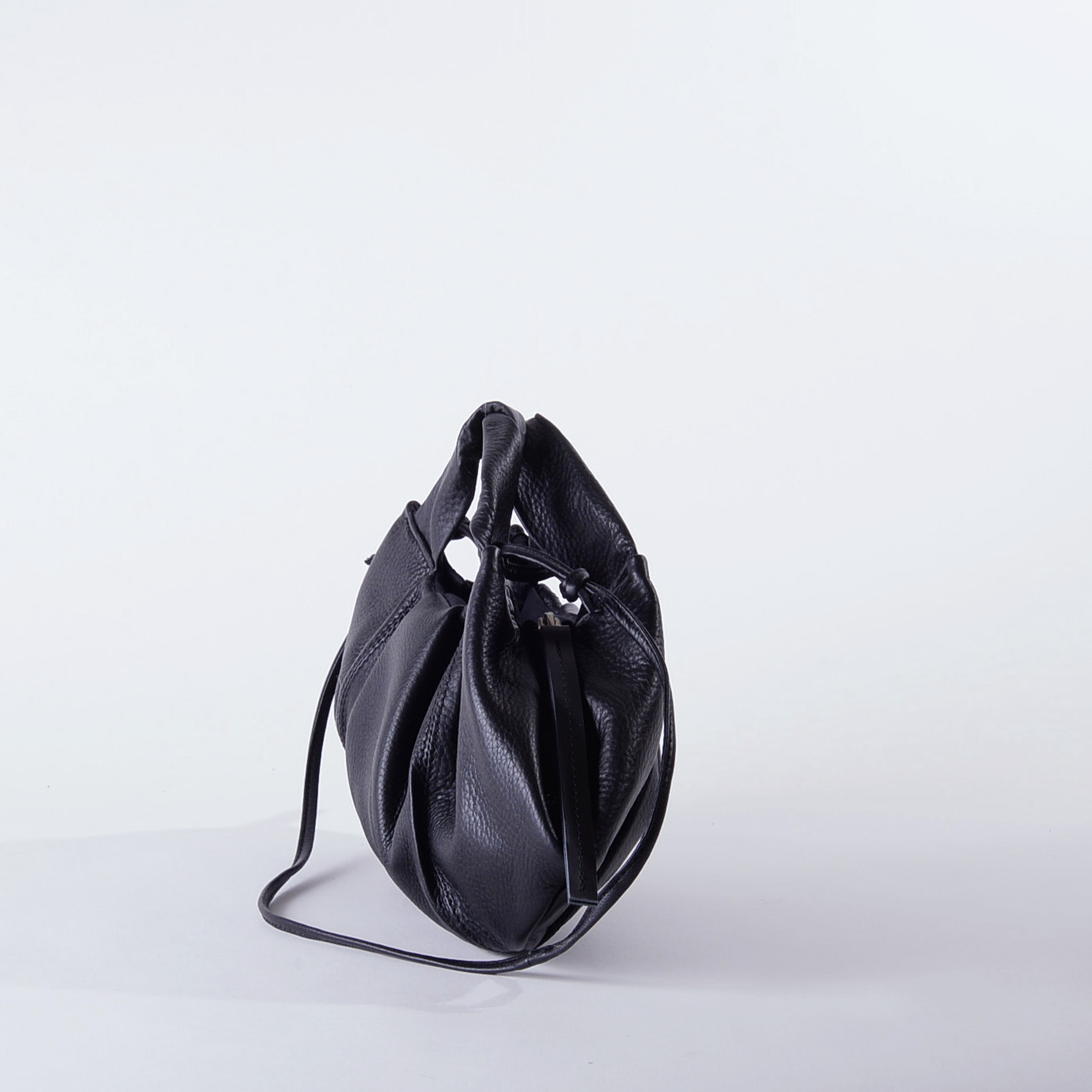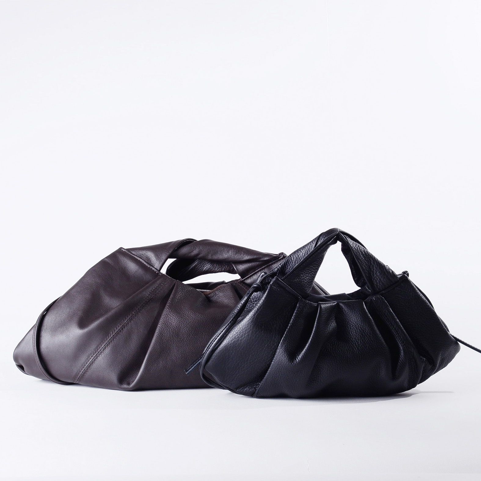 タックが荷物を包み込むような有機的シルエットのバッグ。