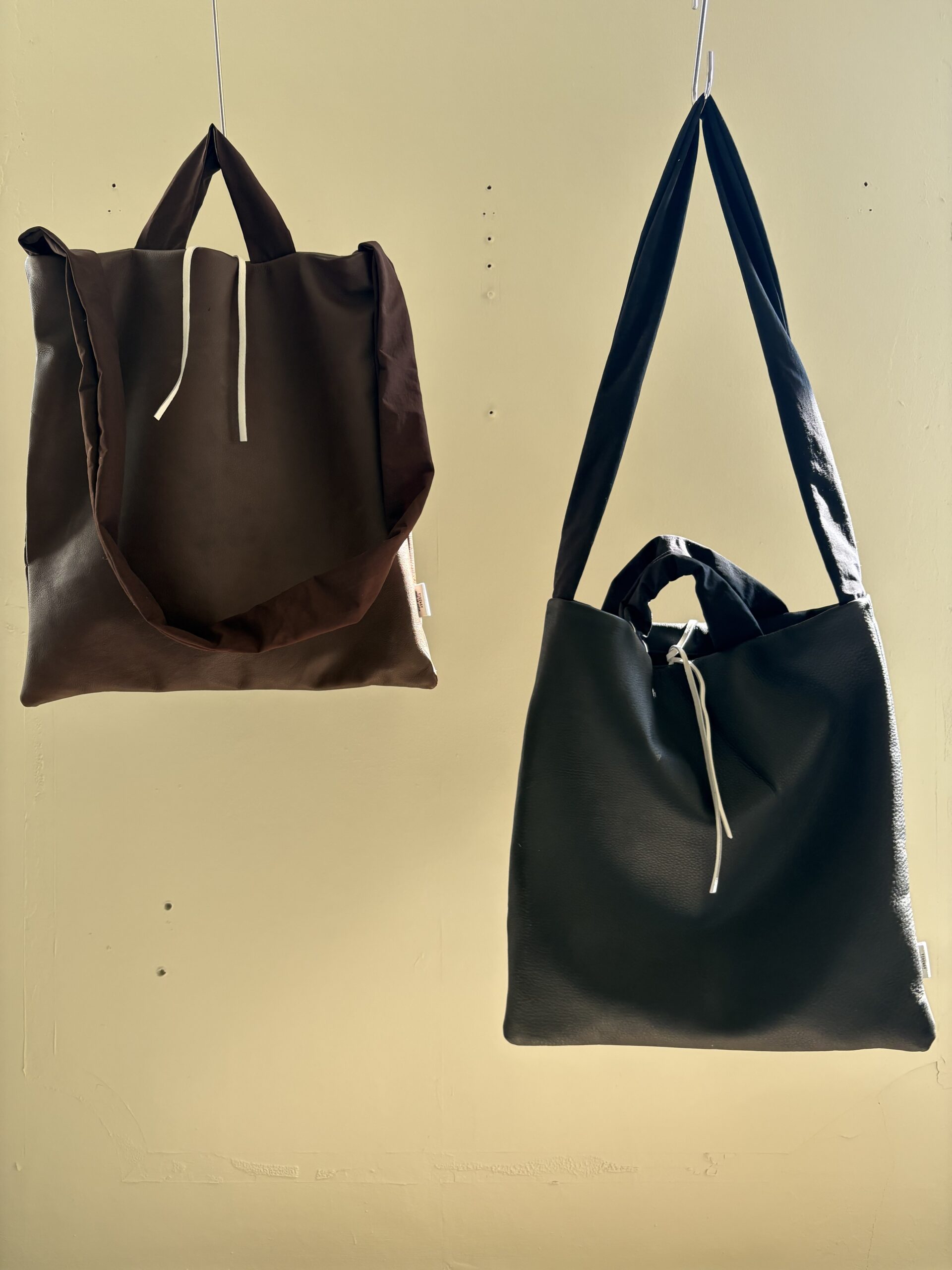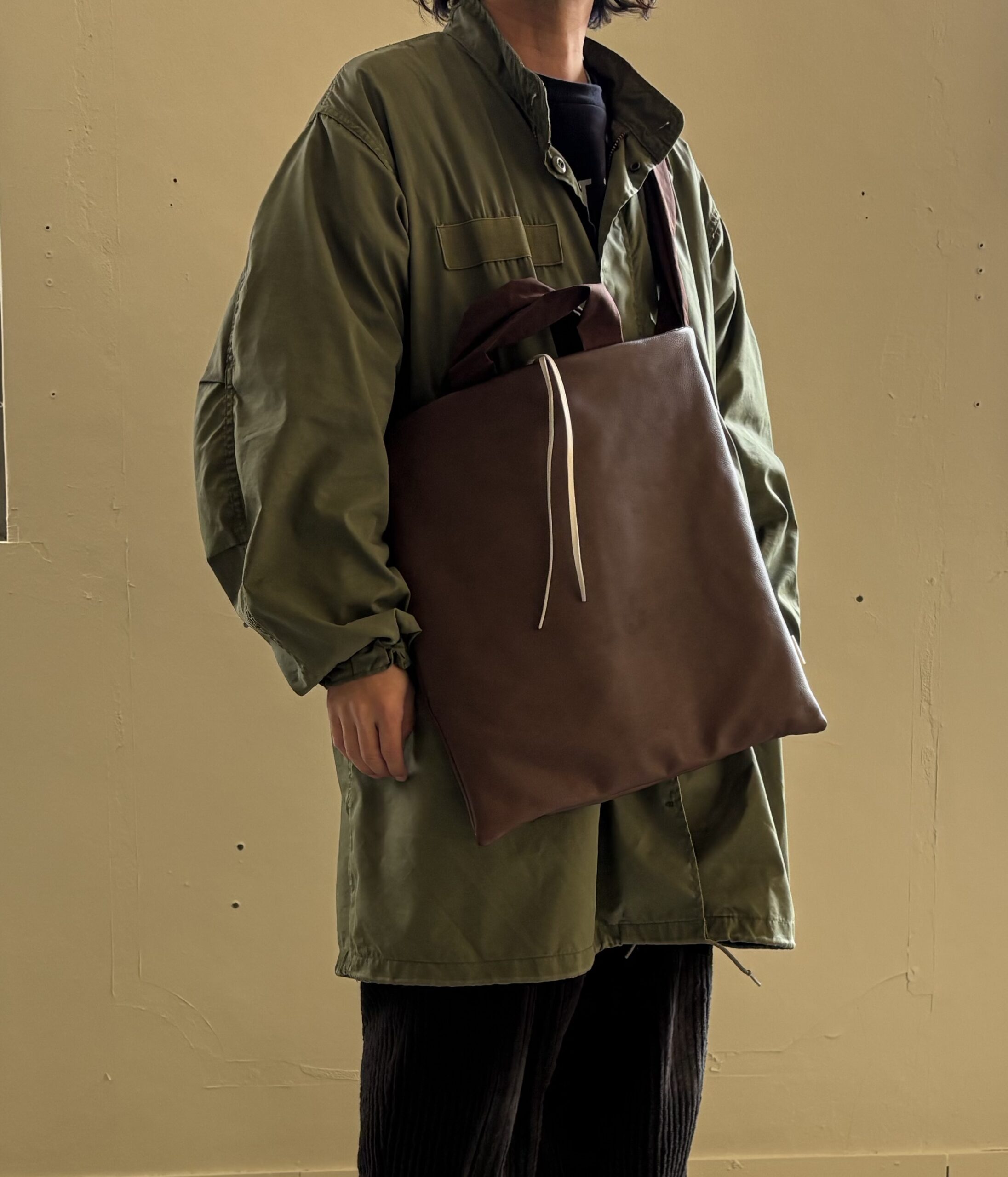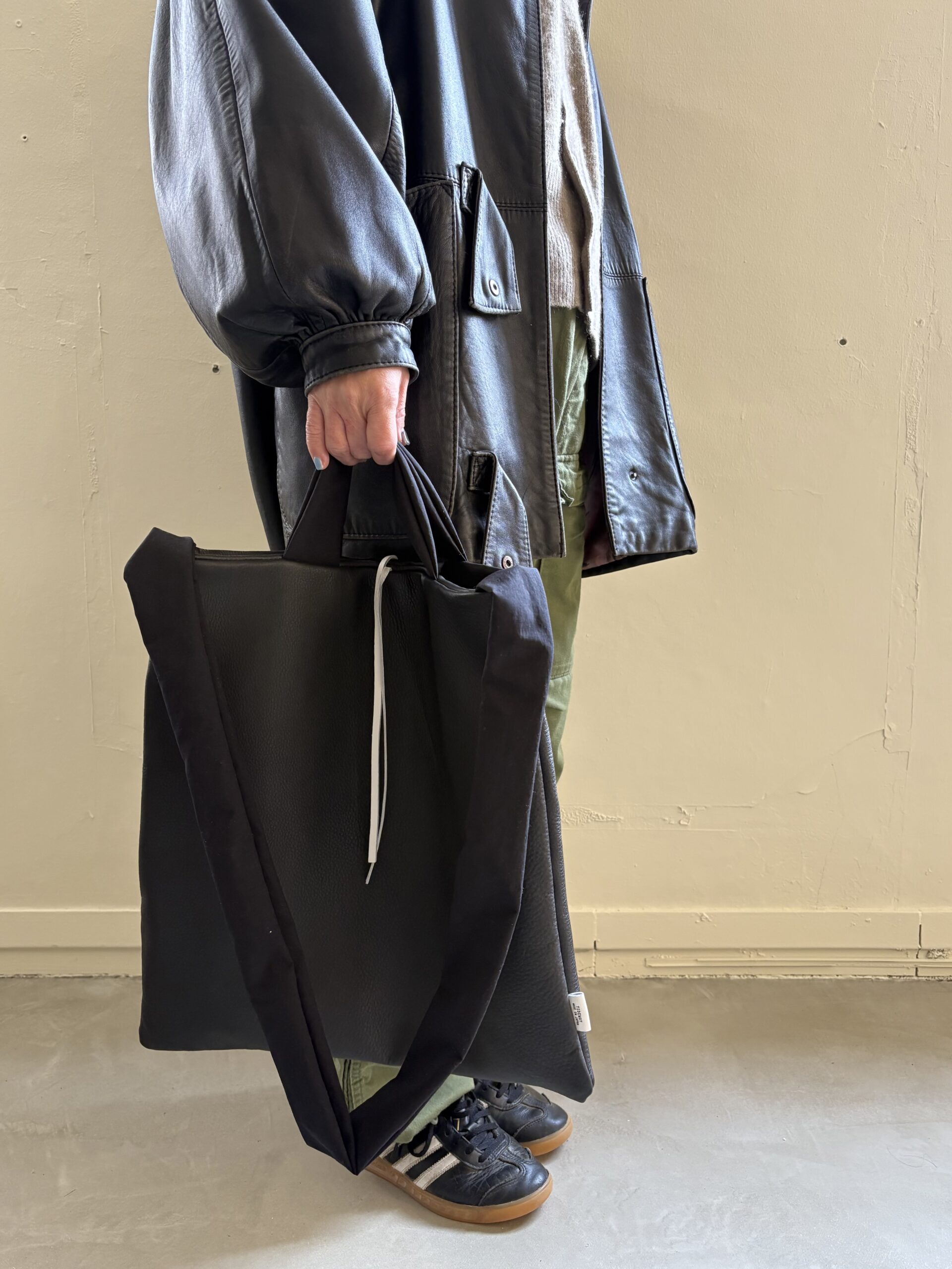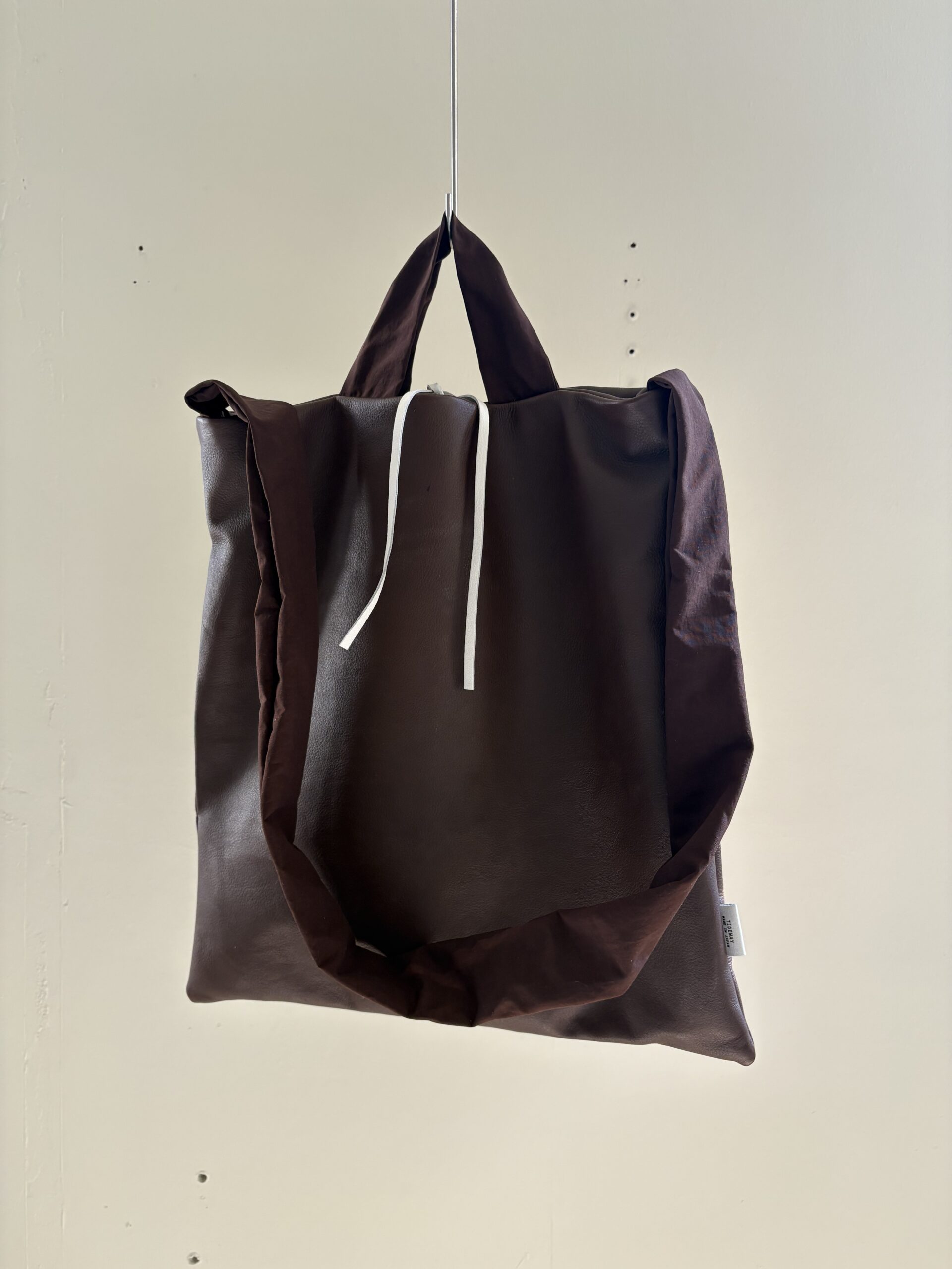 美術館のミュージアムショップに売ってるような簡単なバッグをデザインソースに、贅沢に切り替えなく本体に使った牛革レザーや、極端に太いナイロンの袋手のハンドル、付属に使用しているホワイトのレザーで、個性はありながらもまとまったバッグが完成しました。