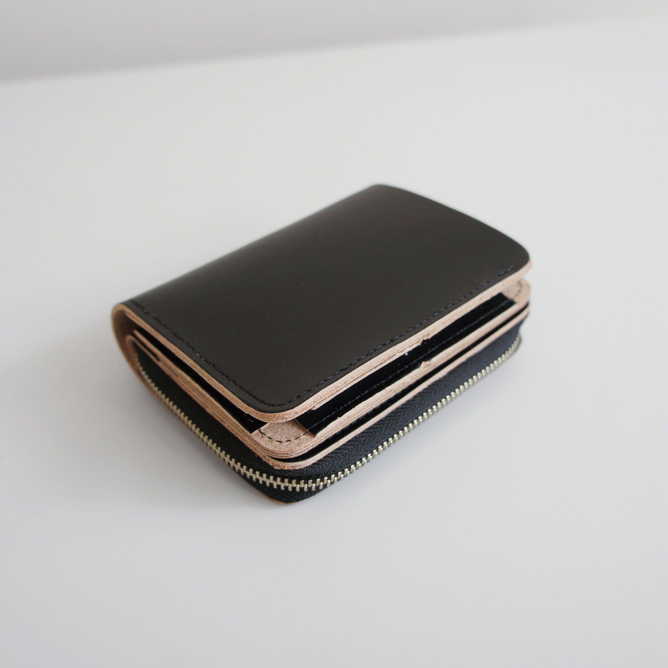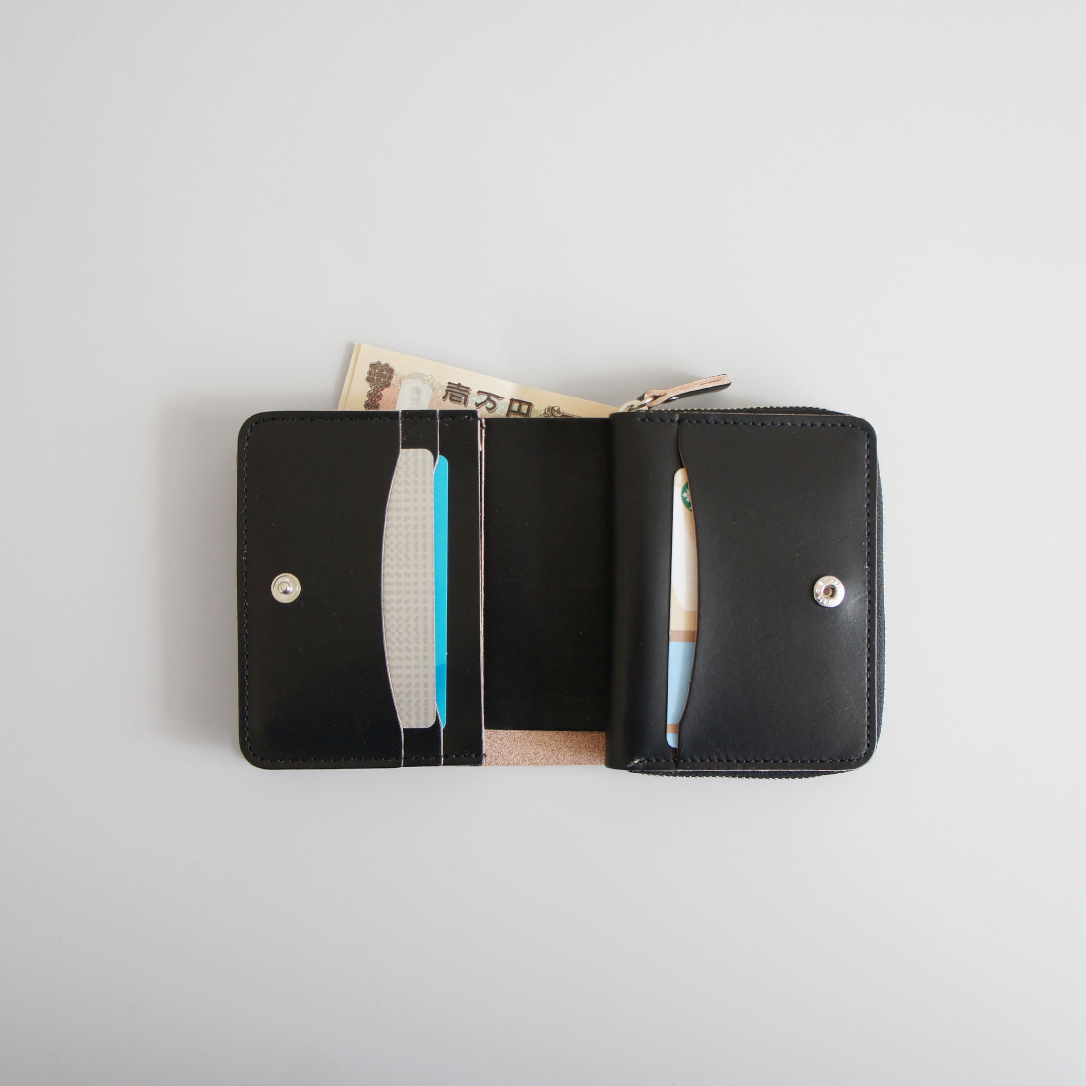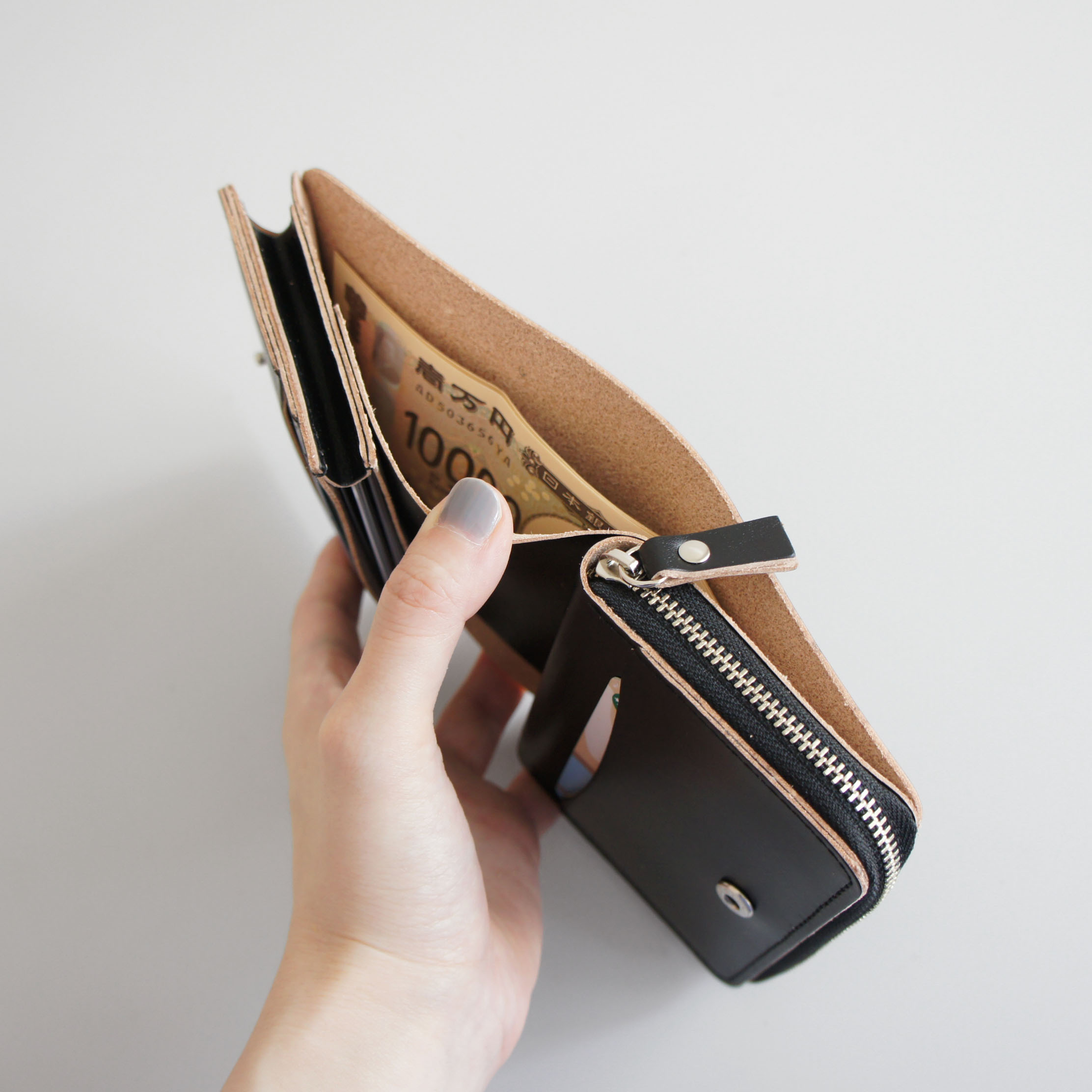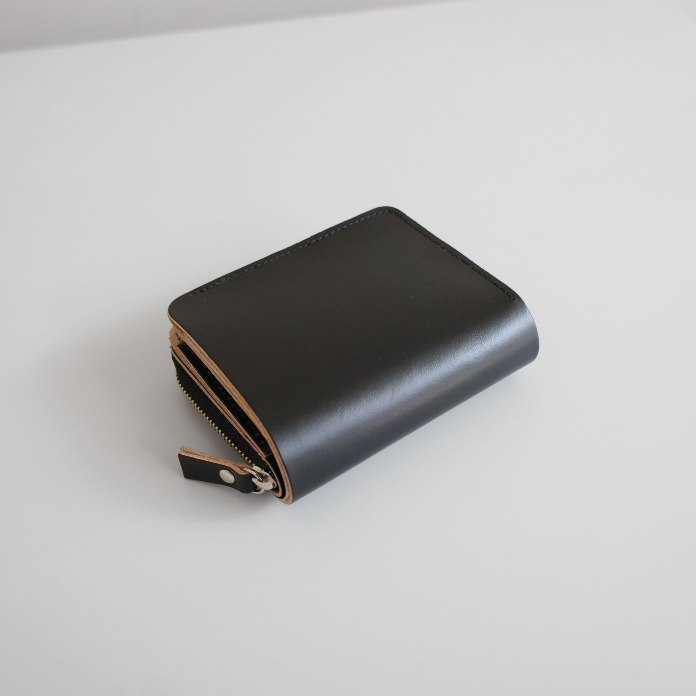ラウンドの小銭ケースは外向きで装着している為、開かずに小銭だけ出し入れできるデザインにしています。