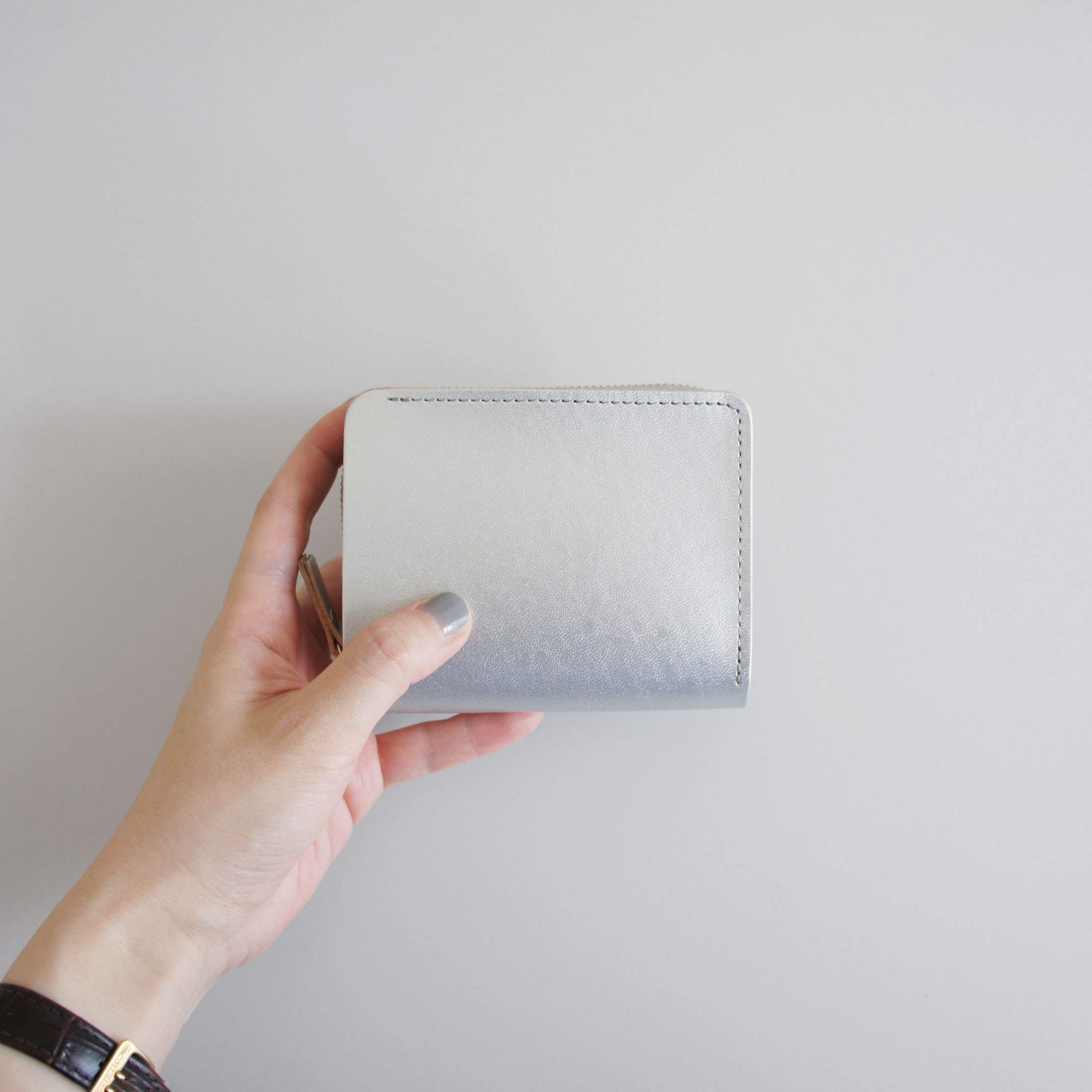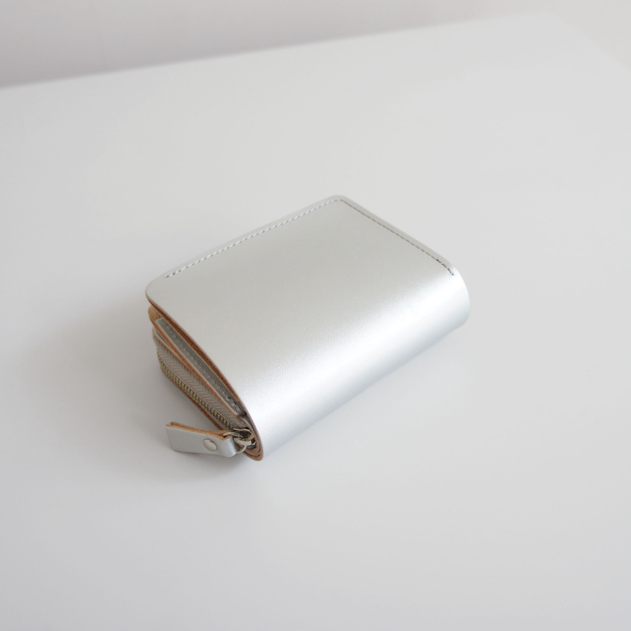 ヌメ革の表面にブラックとシルバーを吹き付けたオリジナルレザーです。レザー断面、床面を染めないで、切り口の色をポイントにするようなデザインにしています。クラフト感がありながらモードな雰囲気を漂わせるシリーズです。