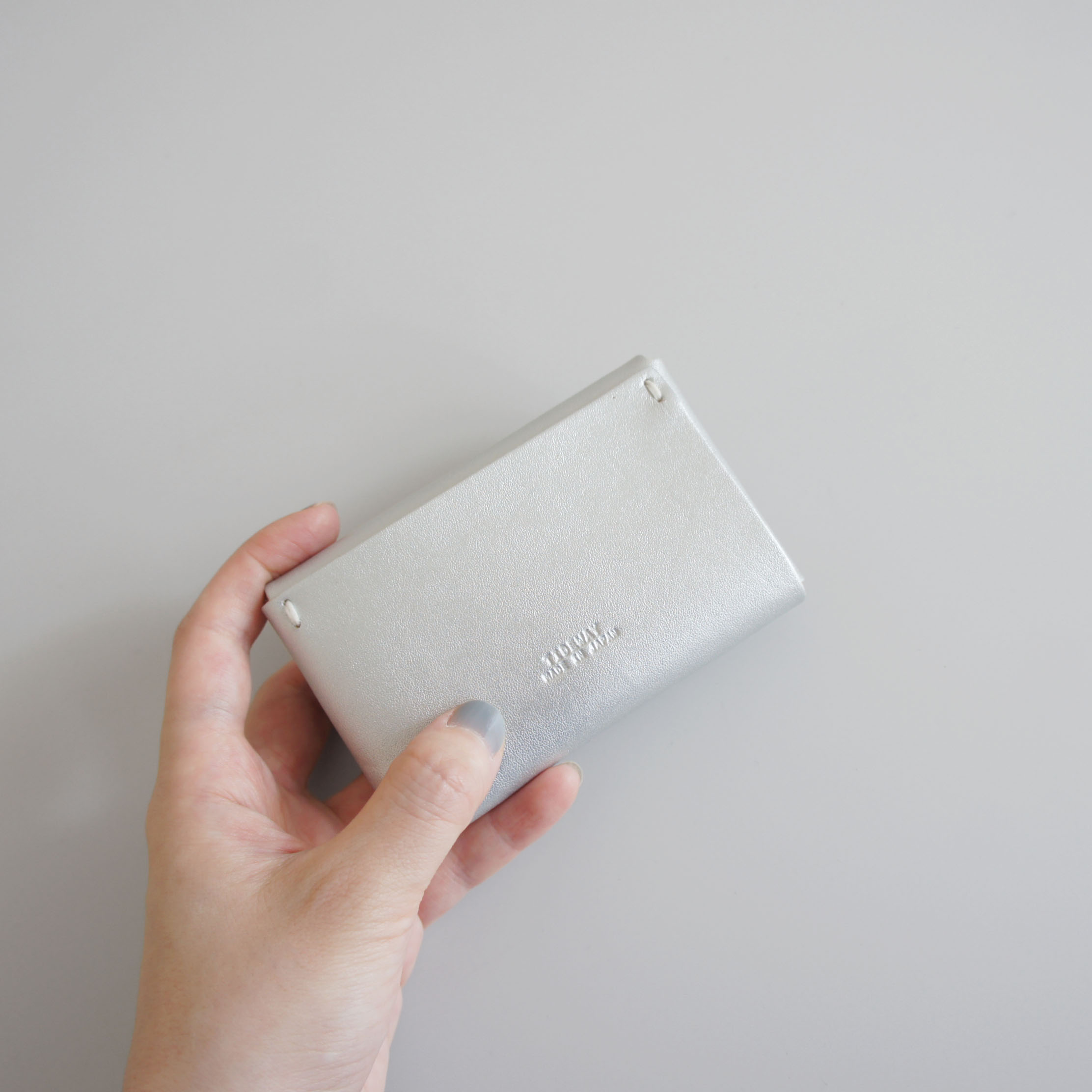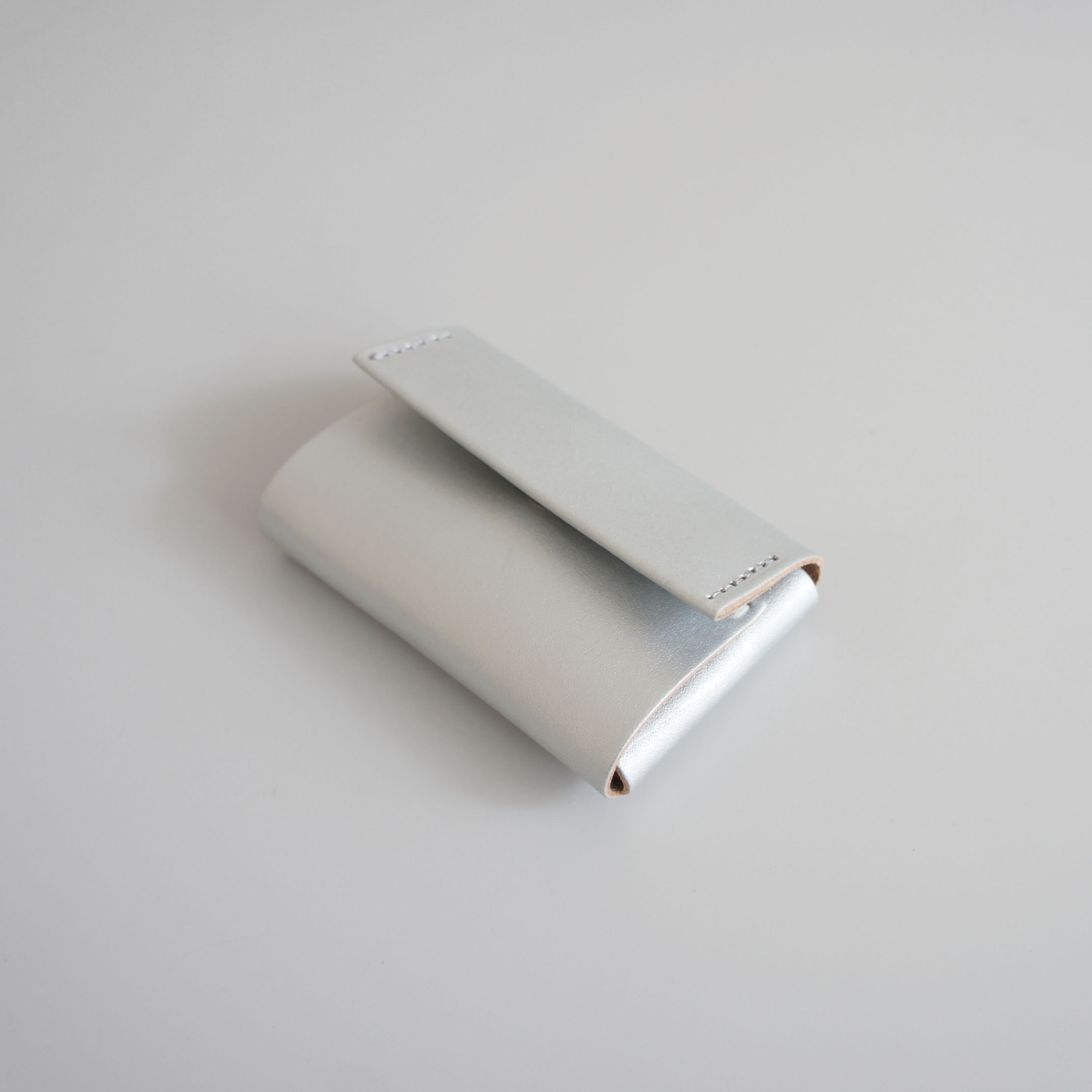 ヌメ革の表面にブラックとシルバーを吹き付けたオリジナルレザーです。レザー断面、床面を染めないで、切り口の色をポイントにするようなデザインにしています。クラフト感がありながらモードな雰囲気を漂わせるシリーズです。