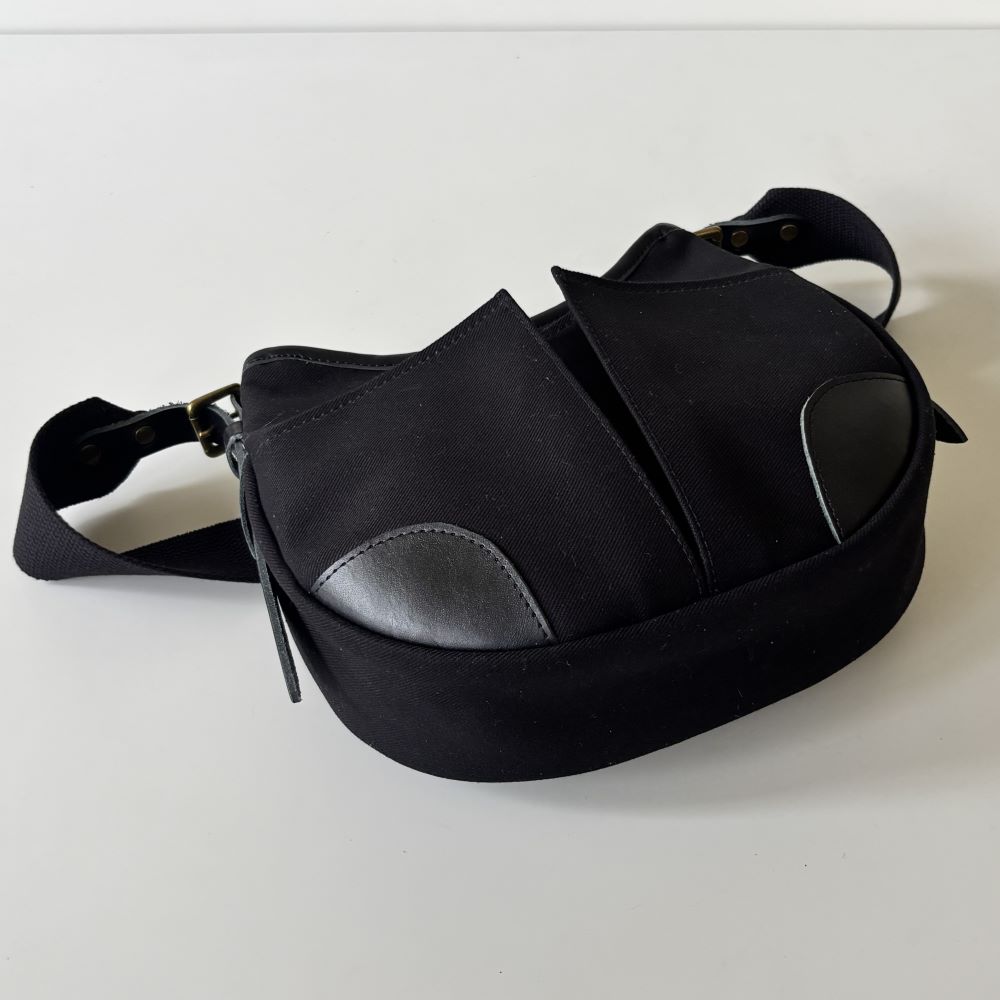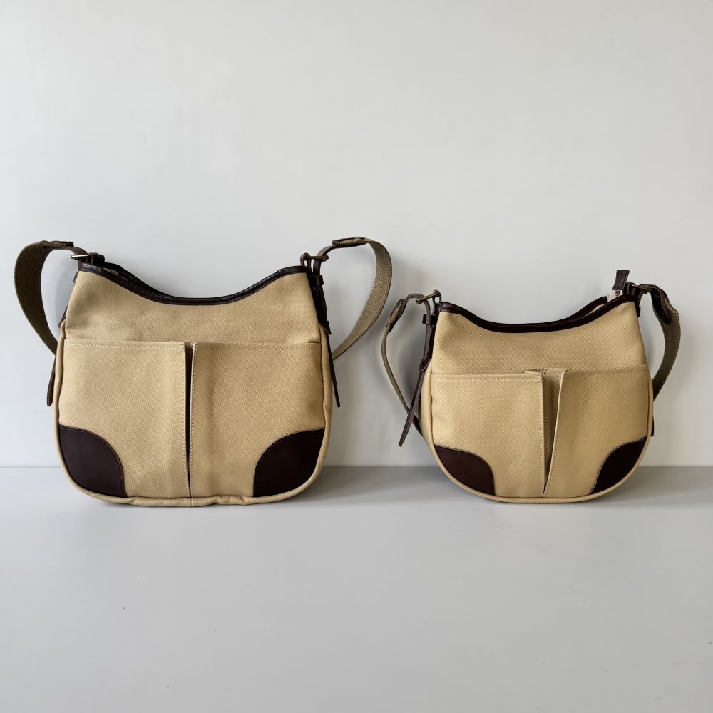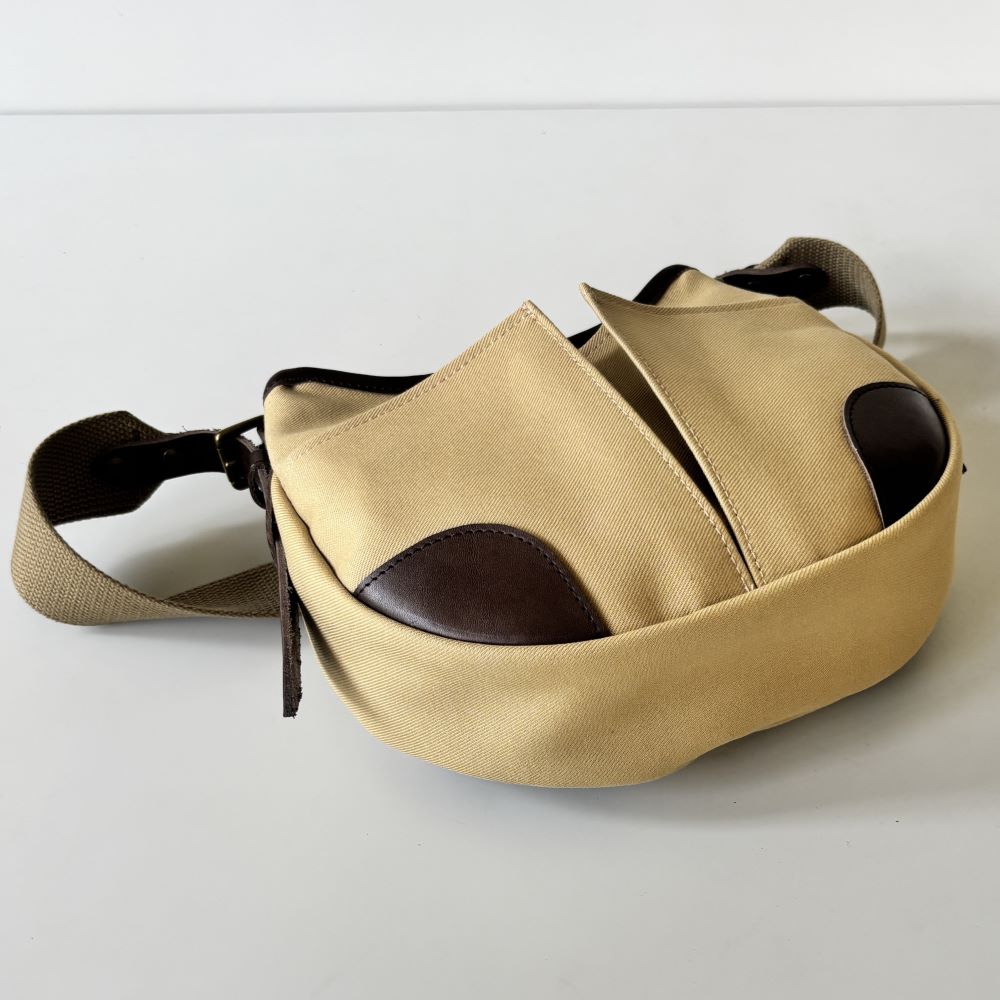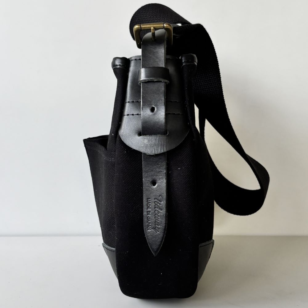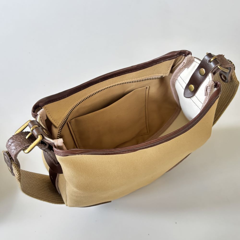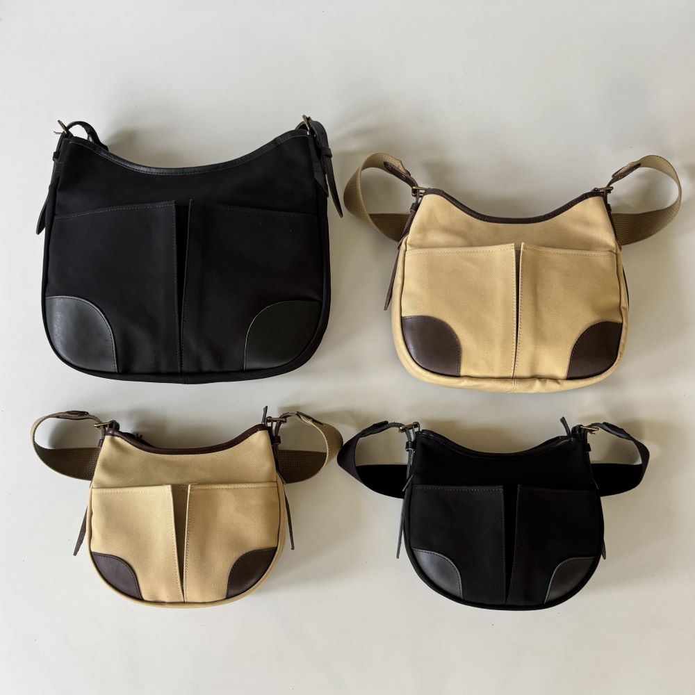 コットンツイル生地をメインに、レザーパーツを組み合わせたミニショルダーバッグ。