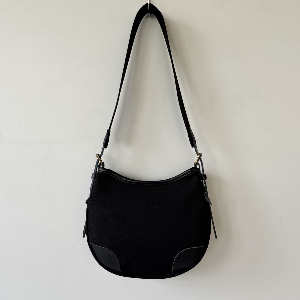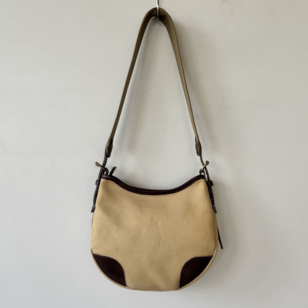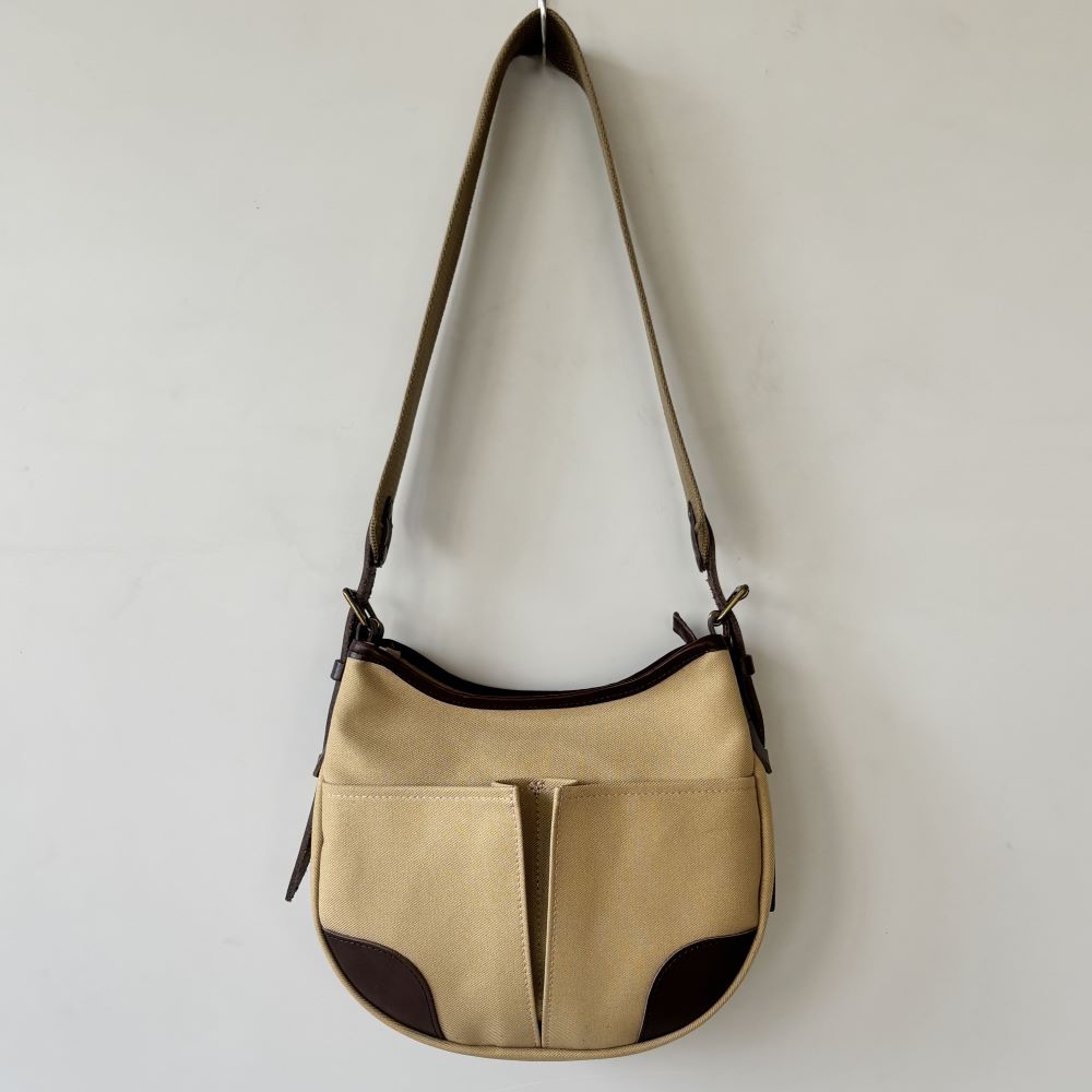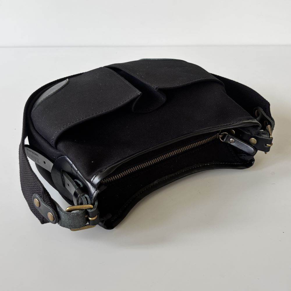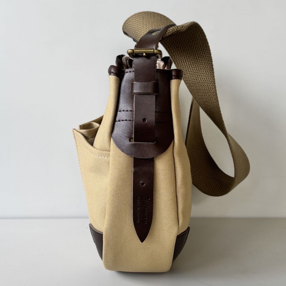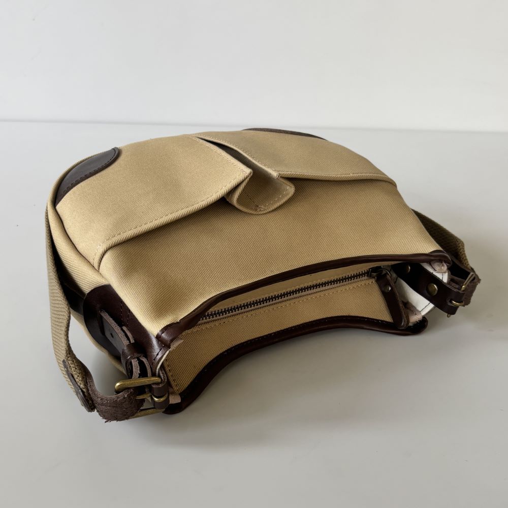 コットンツイル生地をメインに、レザーパーツを組み合わせたミニショルダーバッグ。