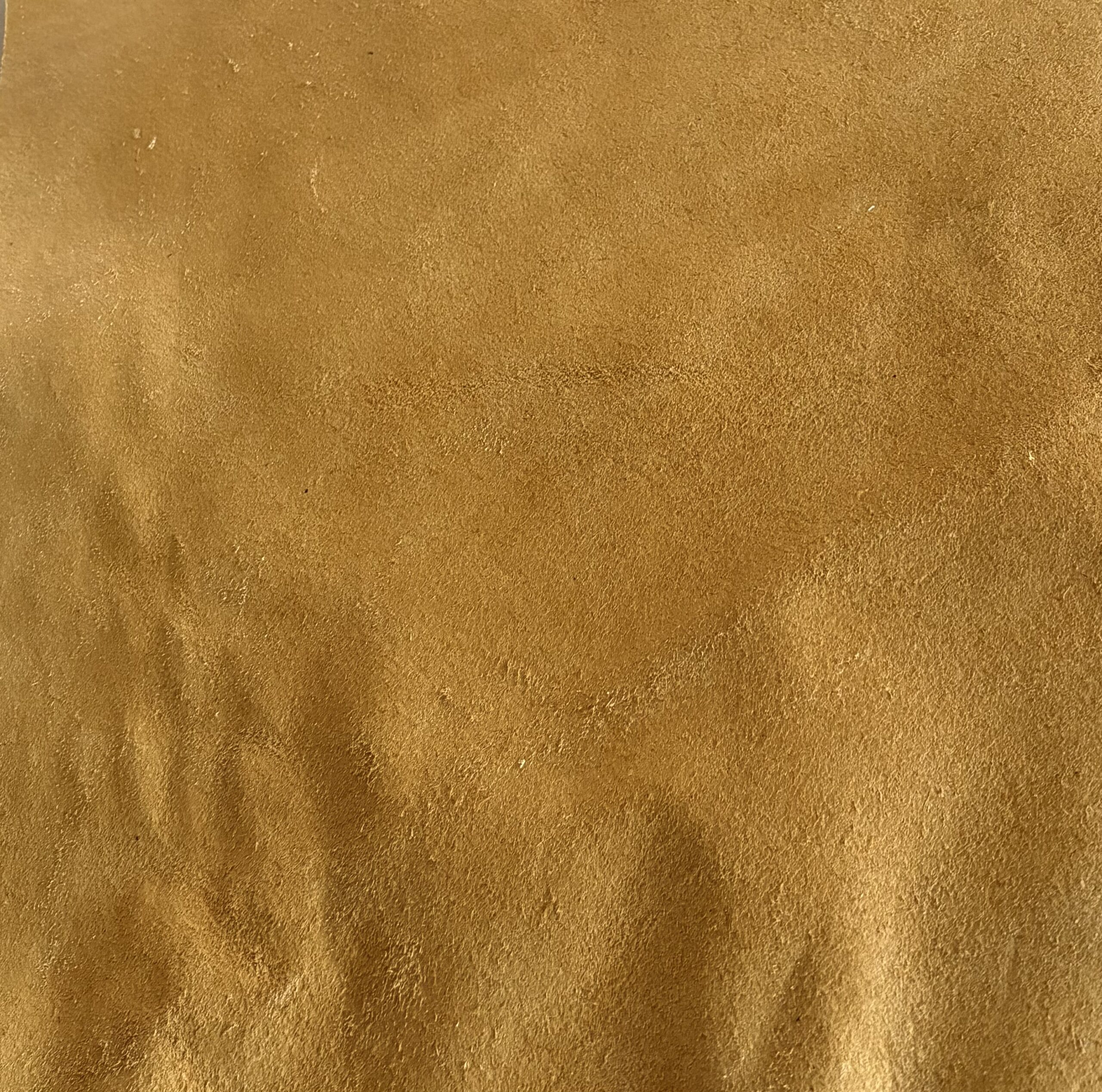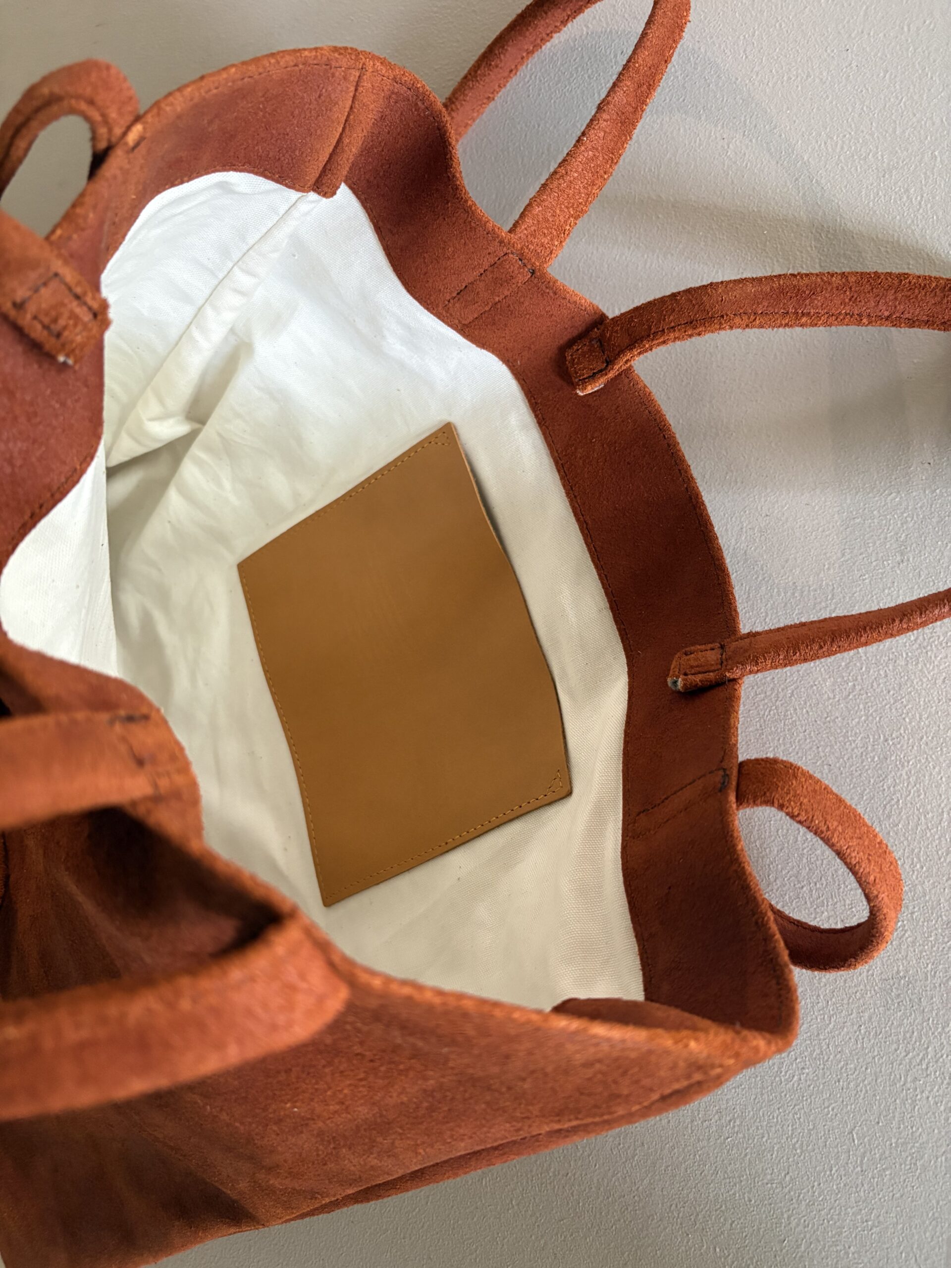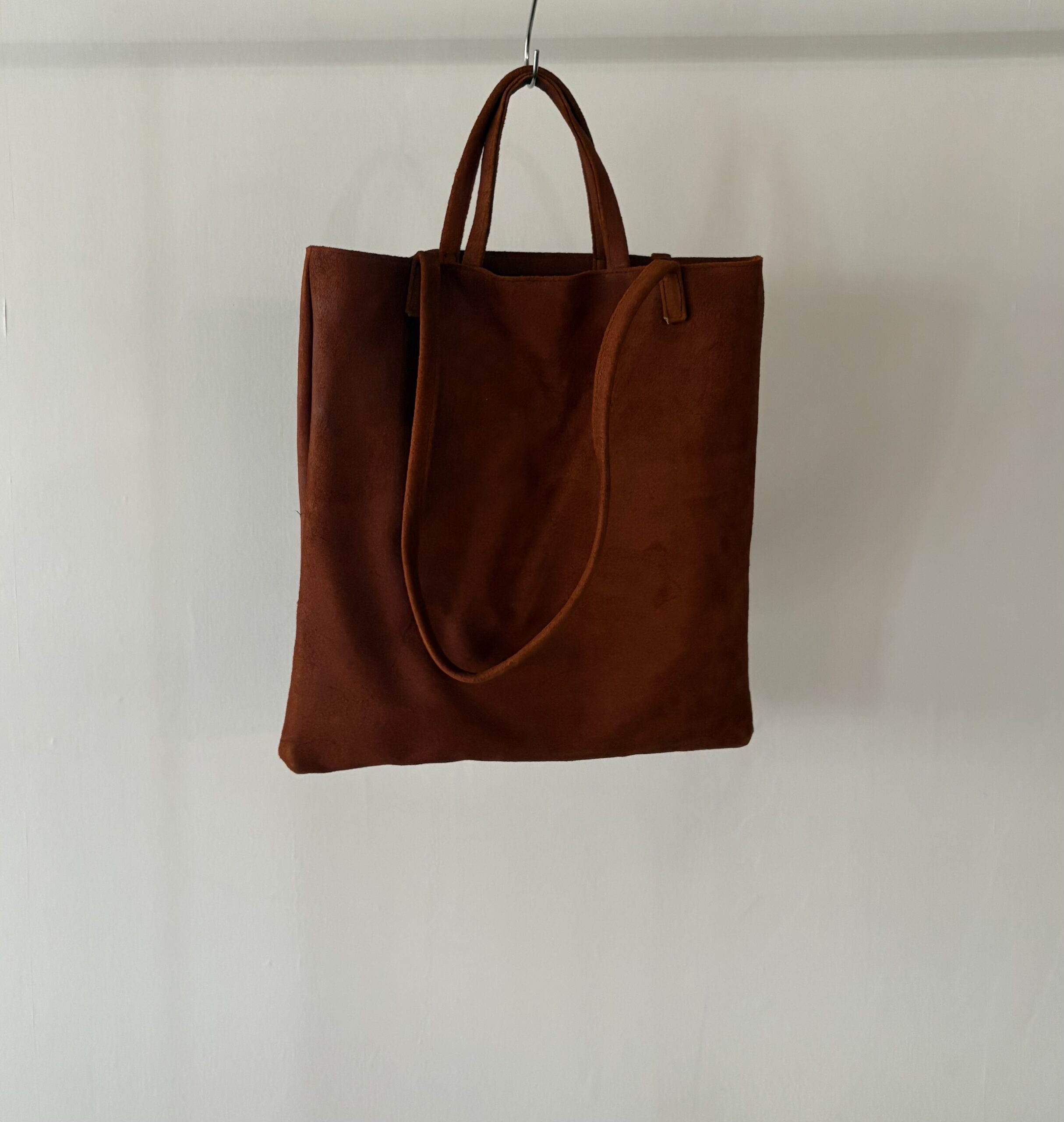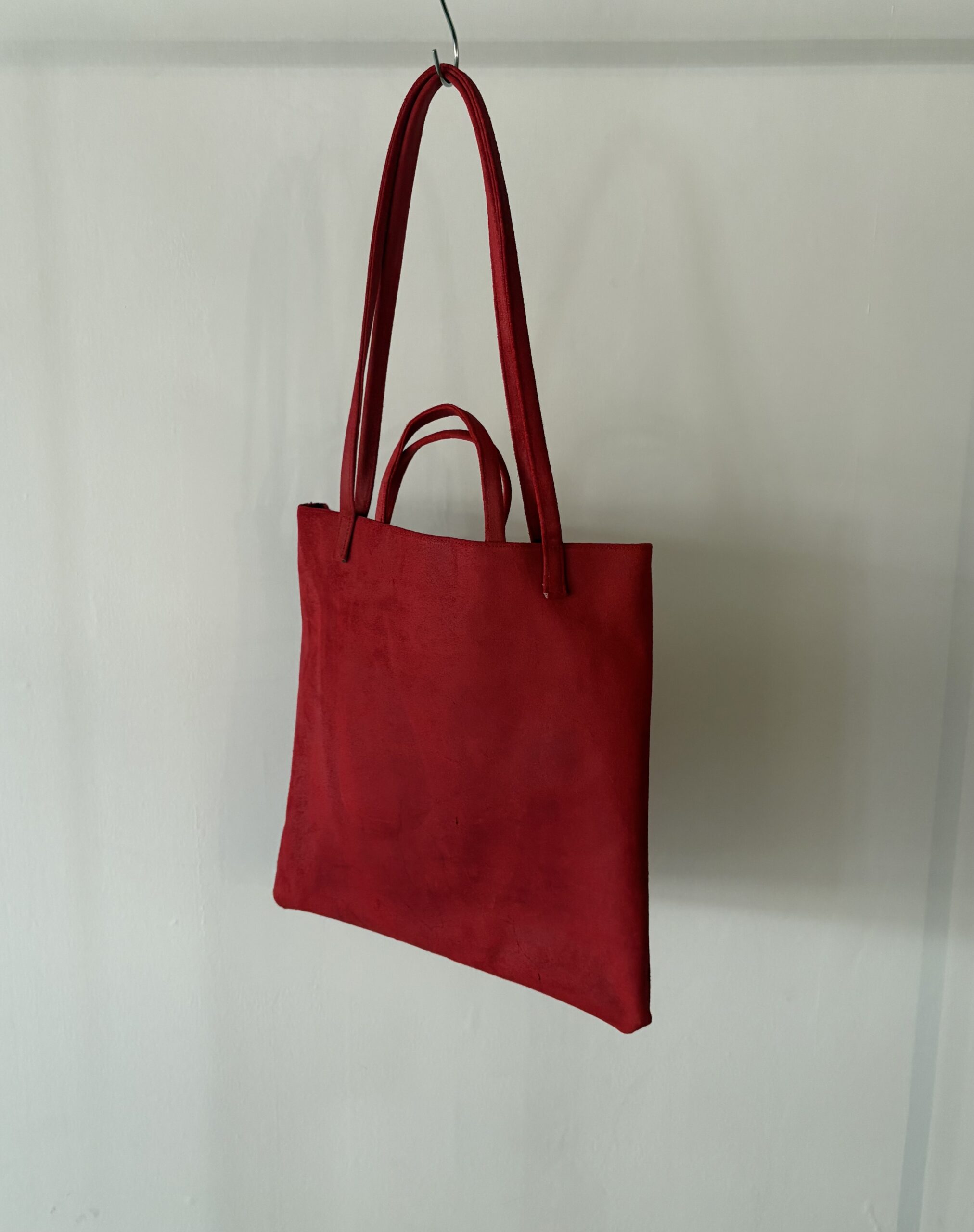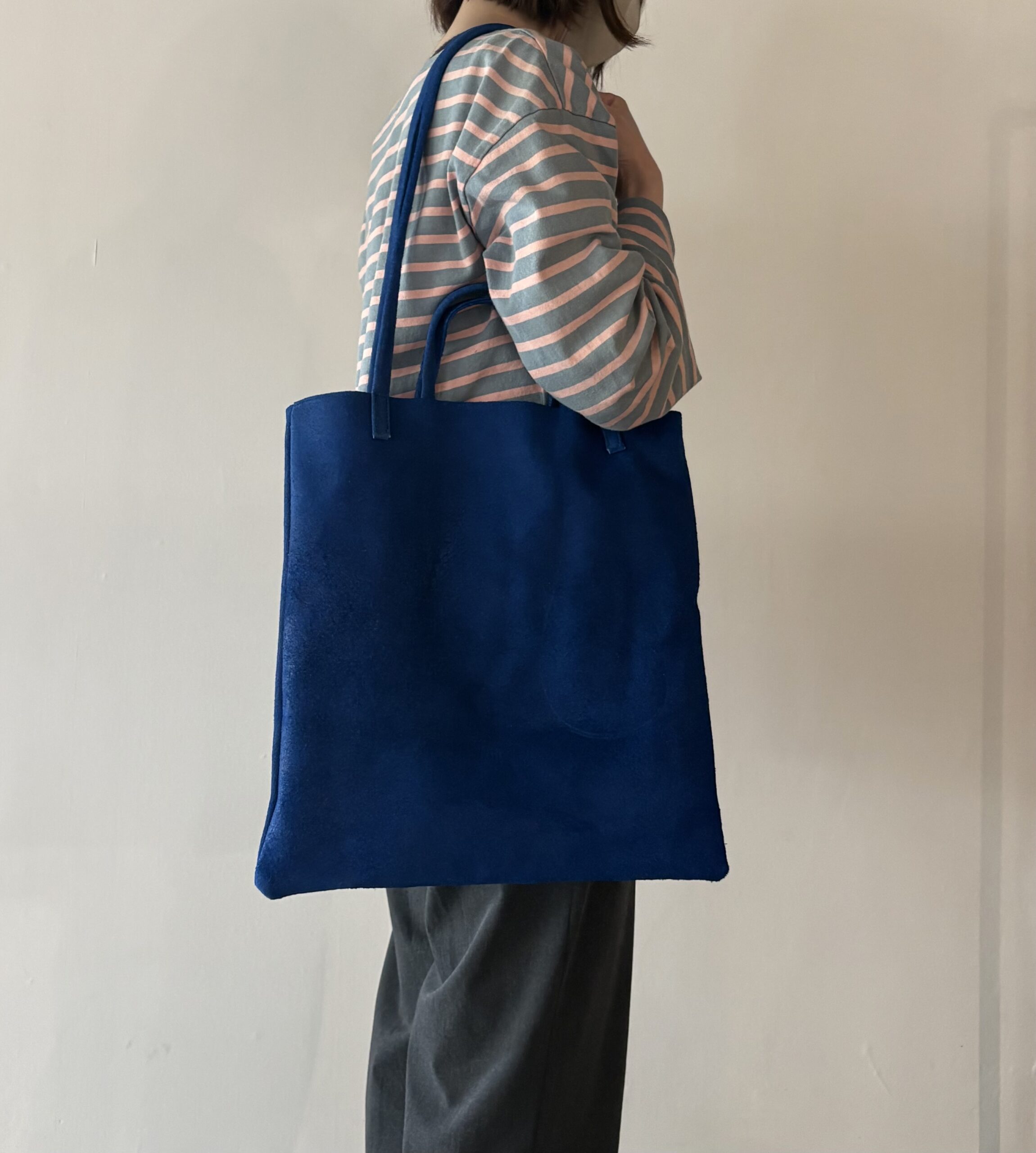 グローブを作る為に梳いた、本来は廃棄する床面を独自の加工で使用できるようにした革を使った商品です。そもそもレザーは食用等の副産物と言われますが、こちらは使い切ったゴミゼロな素材で、エコな素材で作ったエコバッグです。
