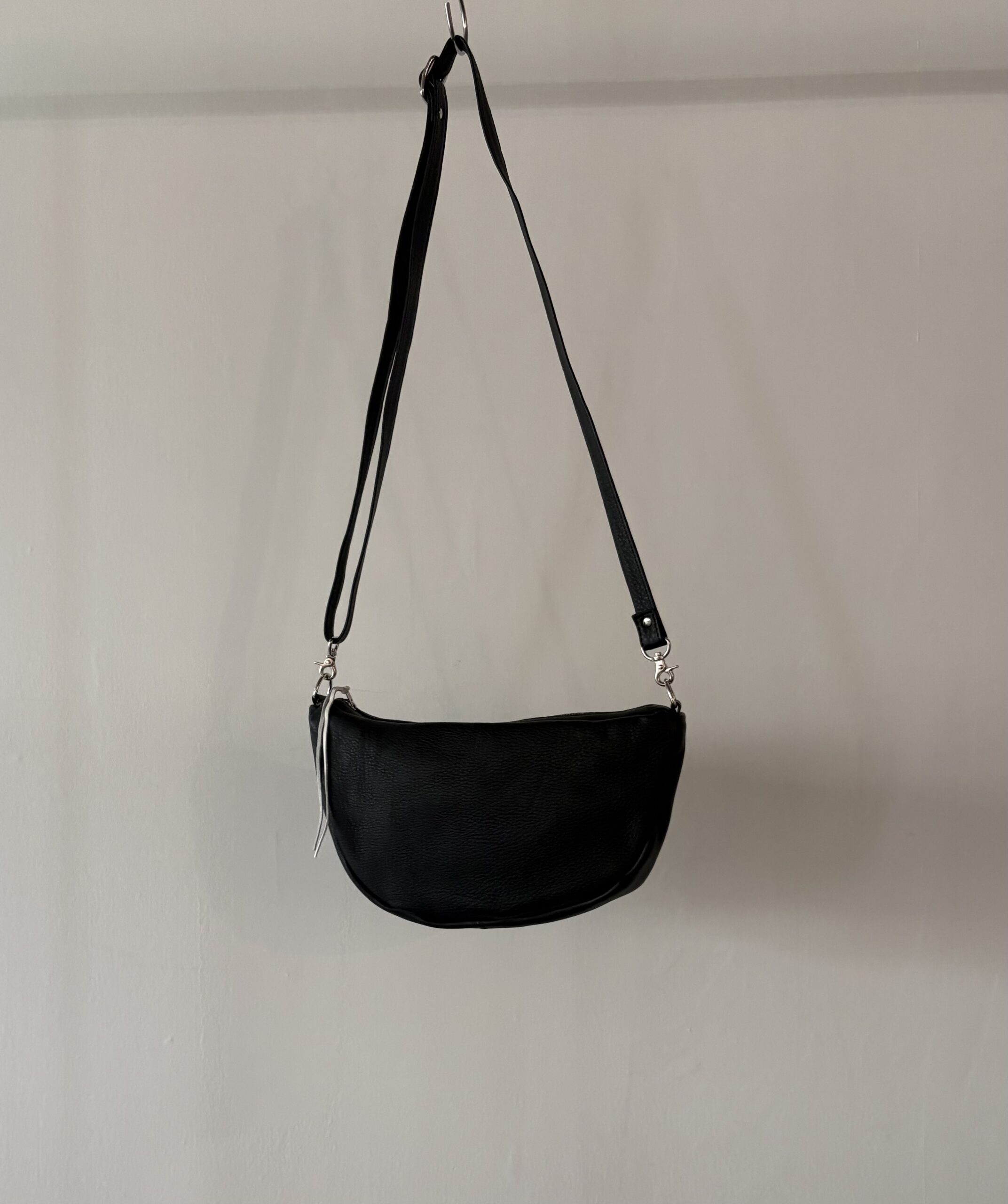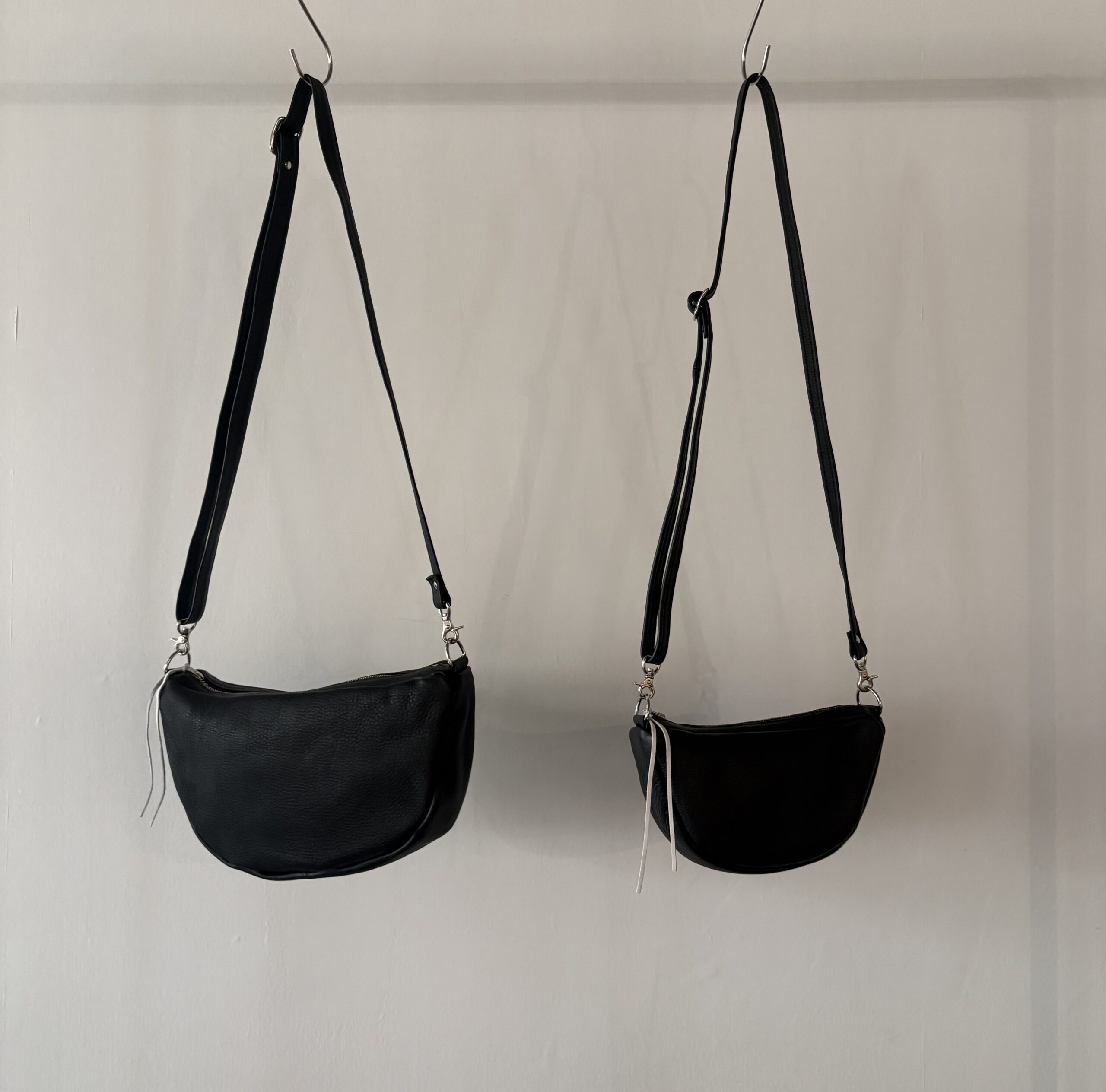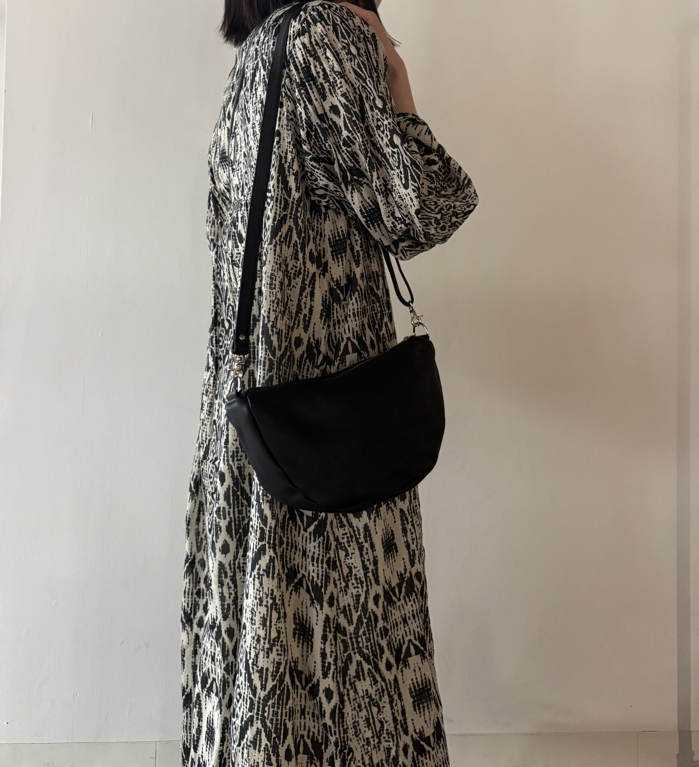 シンプルな半円型のショルダーバッグで、持った時のバランスとデイリーに使いやすいサイズ感をイメージして作成しました。